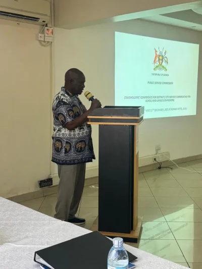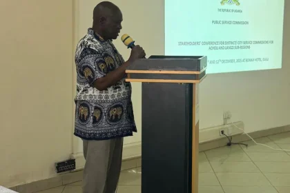 The Hon. Wilson M. Mukasa giving opening remarks at the District and City Service Commissions regional stakeholders’ conference in Gulu City